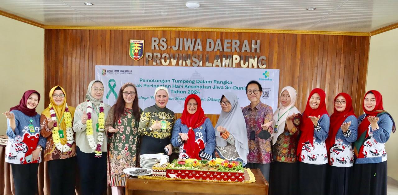 Bandarlampung – Rumah Sakit Jiwa (RSJ) Daerah Provinsi Lampung menggelar potong tumpeng bersama sebagai puncak peringatan Hari Kesehatan Jiwa se-Dunia Tahun 2024, yang jatuh pada tanggal 10 Oktober. Sebelumnya, RSJ Daerah Provinsi Lampung juga telah melakukan bergama rangkain kegiatan dalam rangka memperingati Hari Kesehatan Jiwa se-Dunia Tahun 2024.