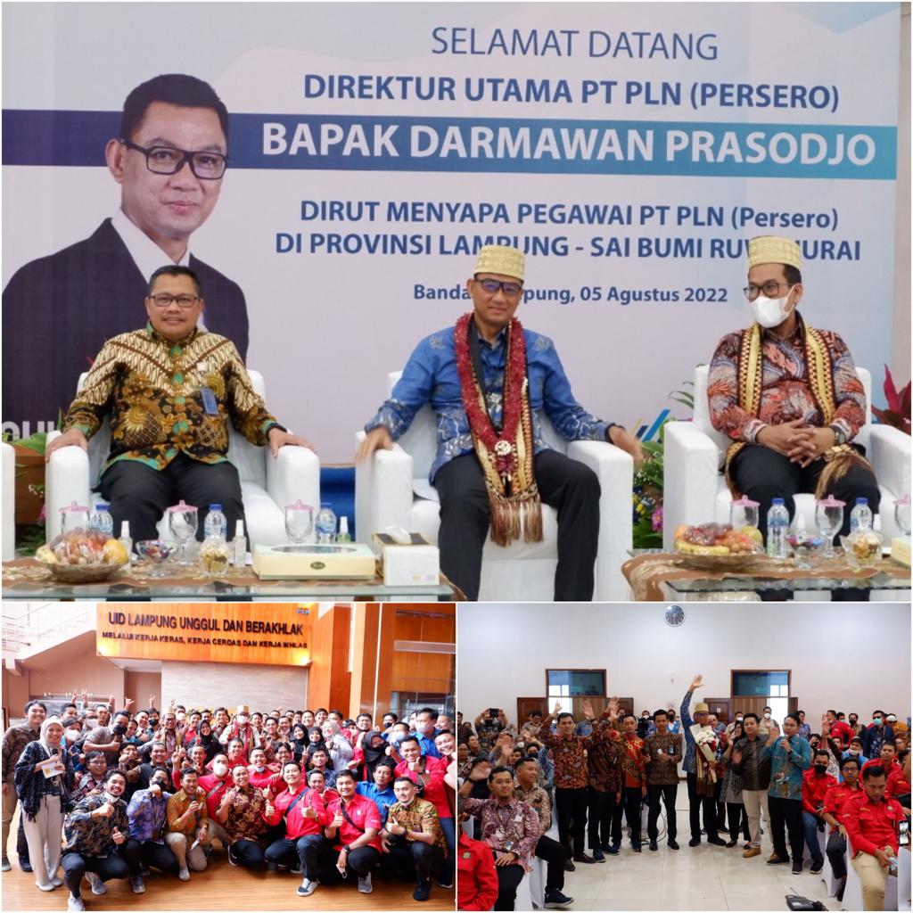Bandarlampung – Direktur Utama PT PLN (Persero), Darmawan Prasodjo dan Direktur Bisnis Regional Sumatera dan Kalimantan, Adi Lumakso hadir di Lampung dalam acara Dirut Menyapa Pegawai PT PLN (Persero) di Provinsi Lampung yang bertempat di Aula lantai 3 PT PLN (Persero) UID Lampung, Jumat (5/8).