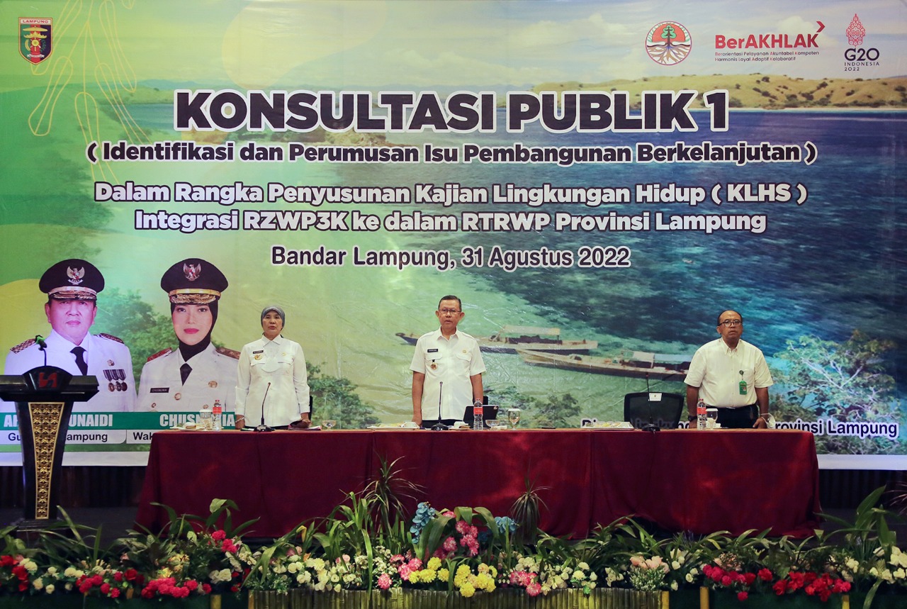 Bandarlampung – Sekertaris Daerah Provinsi Lampung Fahrizal Darminto membuka Konsultasi Publik 1 dalam Rangka Penyusunan Kajian Lingkungan Hidup (KLHS) Integrasi RZWP3K ke dalam RTRWP Provinsi Lampung, di Ballroom Swiss-Belhotel Bandar Lampung, Rabu (31/8).