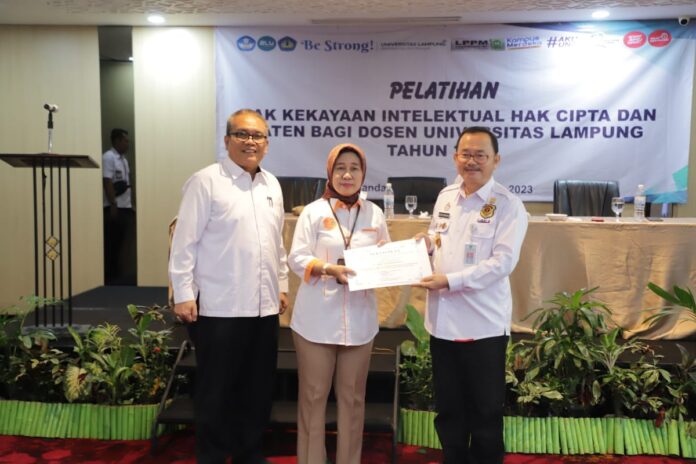Bandarlampung – Sentra Kekayaan Intelektual Lembaga Penelitian dan Pengabdian Masyarakat (LPPM) Universitas Lampung (Unila) menggelar kegiatan Pelatihan Hak Kekayaan Intelektual (HaKI) Hak Cipta dan Paten bagi Dosen Unila tahun 2023, Rabu, 16 Agustus 2023, di Emersia Hotel & Resort.