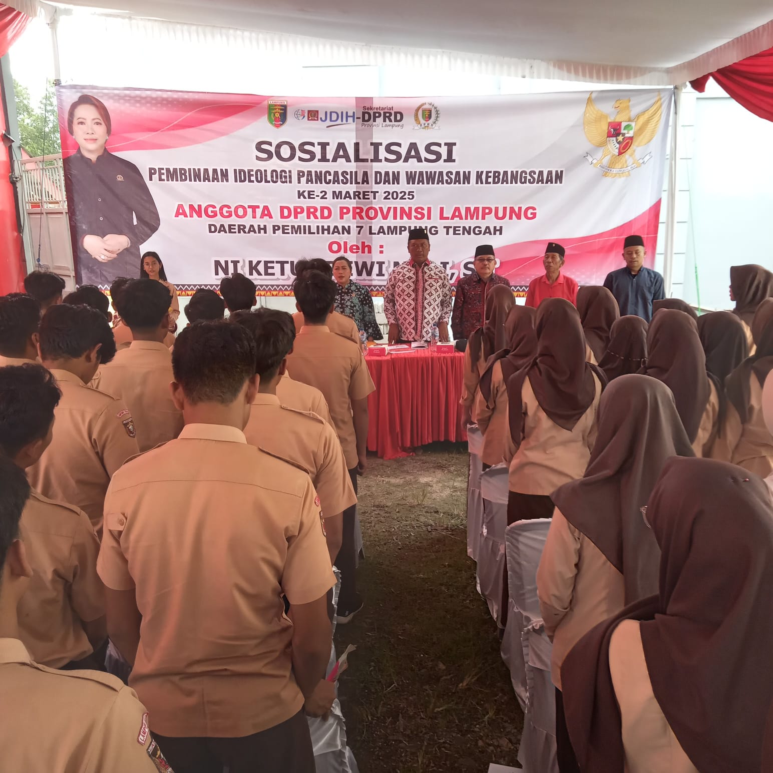 Lampung Tengah – Anggota DPRD Lampung Fraksi PDI Perjuangan Ni Ketut Dewi Nadi, ST kembali menggelar sosialisasi pembinaan Ideologi Pancasila dan Wawasan Kebangsaan ( IPWK ) tahap ke-2 Maret 2025 di Kota Gajah, Lampung Tengah, Sabtu ( 22/03 ).