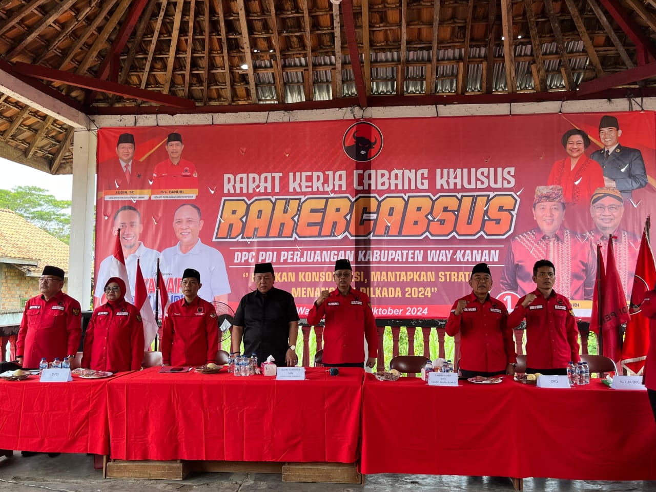 Rakercabsus yang mengusung tema “Kuatkan Konsolidasi, Mantapkan Strategi, Menangkan Pilkada 2024” dihadiri pengurus DPD PDI Perjuangan Lampung, Umar Ahmad, Watoni Nurdin, Mau Sari Berty, Cik Raden, Donald Harris Sihotang dan Anggota DPRD Lampung, Sholihin dan Sahdana. Selanjutnya, Calon Gubernur Incumben Lampung Arinal Djunaidi dan Calon Wakil Bupati Way Kanan nomor urut 1 Cik Raden