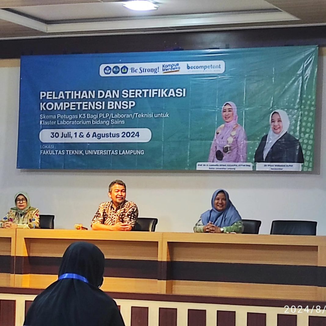 Bandarlampung – Delapan puluh tenaga kependidikan (tendik) PLP/laboran/teknisi laboratorium di lingkungan Universitas Lampung (Unila) mengikuti pelatihan dan sertifikasi skema pelaksana K-3 yang diakui Badan Nasional Sertifikasi Profesi (BNSP).