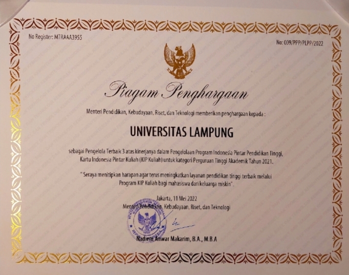 Bandarlampung – Universitas Lampung (Unila) meraih Penghargaan Anugerah Terbaik Ketiga Pengelolaan Program Indonesia Pintar (PIP atau KIP-Kuliah) Tahun 2021 Tingkat Perguruan Tinggi, dari Kementerian Pendidikan, Kebudayaan, Riset, dan Teknologi (Kemendikbudristek) Republik Indonesia, Jumat (17/6).